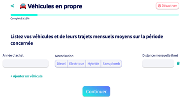 Si votre entreprise possède une flotte de véhicules (en propre ou en leasing), vous devez les renseigner dans "Déplacements" - Véhicules en propre. Si vous avez plus de 15 véhicules, vous pouvez utiliser un fichier d'import pour collecter ces éléments.