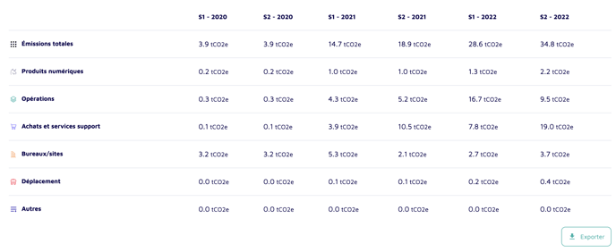 Les tableaux détaillés de vos émissions, reprenant toutes vos données, vues par catégories ou par scopes.